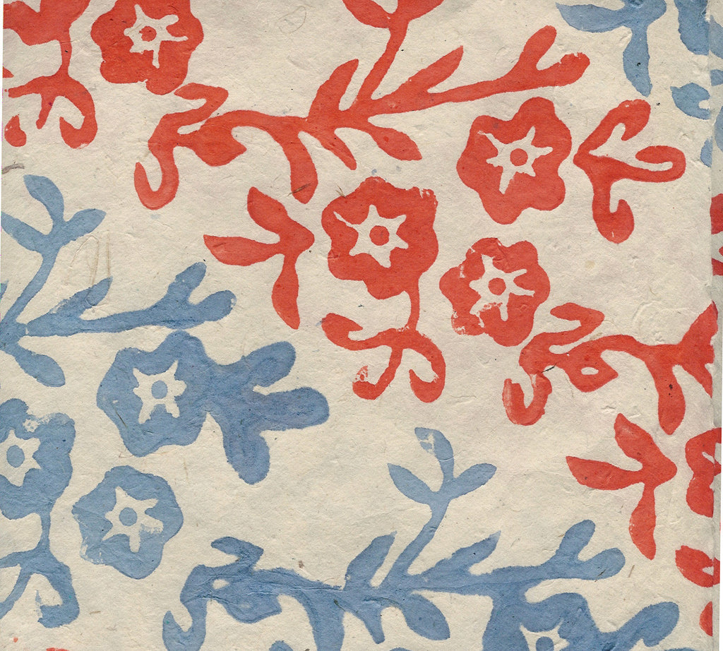 This woodblock pattern is our exclusive design; a happy bouquet of flowers printed in periwinkle and orange ink on natural lokta paper.