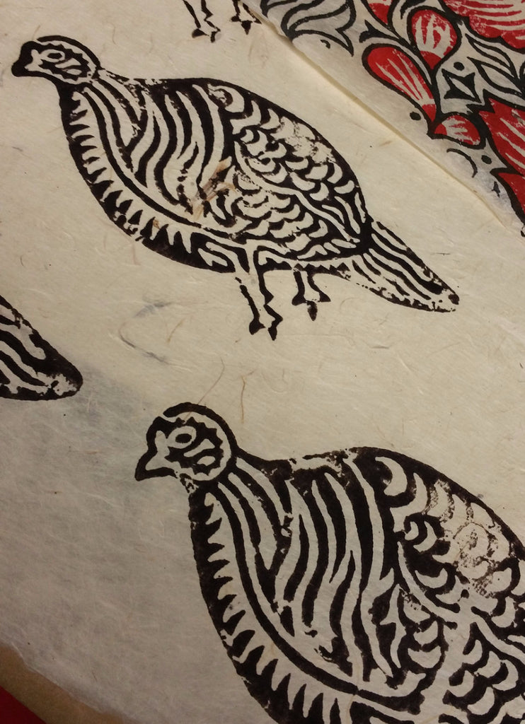 Woodblock printmaking methods are used for this Lokta series. Featuring animals, florals, and traditional motifs in either red and black combinations, greens, blues, and other fun color combinations.