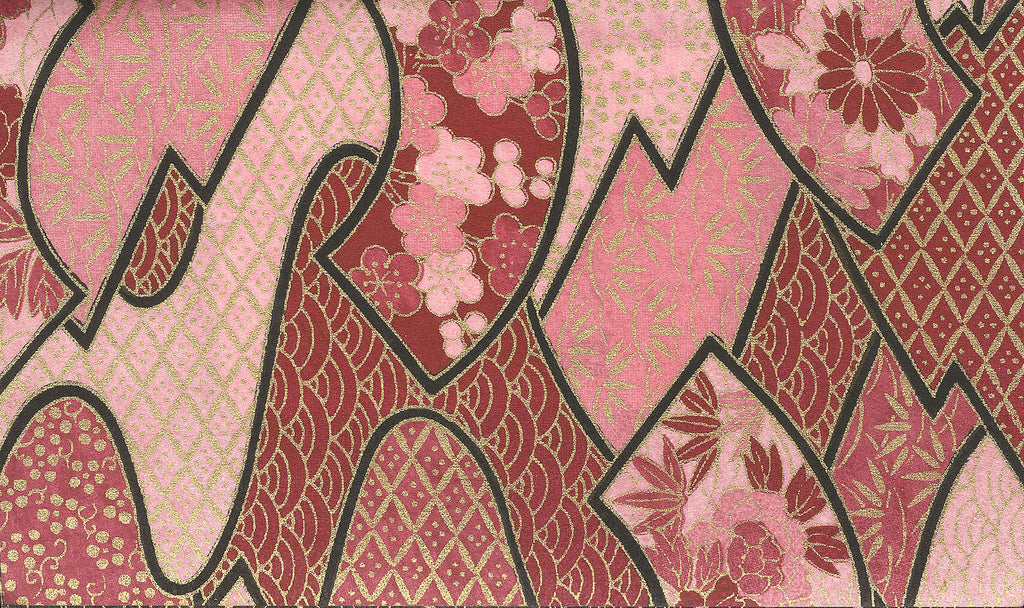 Traditional Japanese motifs on hues of rose and pink, a Yuzen classic.