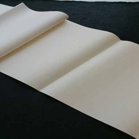 A limited edition scroll-size kana paper in 10-sheet packs in stock now for limited time. Sheets are made from mitsumata, bamboo and kozo handmade and cut into a scroll shape in Kochi, Japan. This paper can be used for backing cloth, or mounting on a scroll. Works well with sumi ink for painting or calligraphy, however, can be used for printing, drawing and oil-based inks.